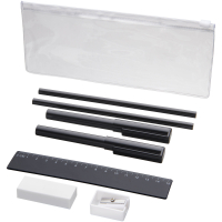Piórnik PVC z 2 długopisami (1 z czarnym atramentem, drugi z niebieskim), 2 ołówki, linijka, temperówka i gumka.