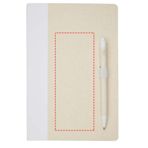 Zestaw z notatnikiem w formacie A5 i długopisem. Notatnik zawiera 80 kartek w linie (80 g/m²) wykonanych z poddanych recyklingowi kartonów po mleku (do 70%), grzbiet z kolorowego papieru i pętelkę na długopis. W pętelce na długopis znajduje się długopis na przycisk w dopasowanym do notatnika kolorze. Długopis ma korpus wykonany z tego samego materiału z kartonów mleka poddanych recyklingowi, a przycisk, klips i końcówka są wykonane z kolorowego tworzywa sztucznego PLA. W środku długopisu znajduje się czarny wkład. Zużyte kartony po mleku są zbierane, sortowane, przetwarzane i zamieniane w papier, co pozwala na przekształcenie odpadów w coś użytecznego.