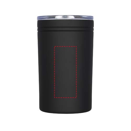 Kubek o podwójnych ściankach, izolowany próżniowo. Przeźroczyste, wciskane wieczko z przesuwanym zamknięciem. Działa jak kubek lub termos. Pojemność 330ml.