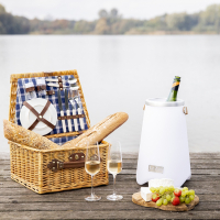 Le Zen Original to stylowa chłodziarka do wina z bezprzewodowym głośnikiem BlueTooth i oświetleniem LED (otoczenia). Funkcja nastrojowego światła oferuje siedem różnych kolorów i można ją zmieniać za pomocą dołączonego pilota. Cooler jest wodoodporny i odporny na wstrząsy. Rączka z wegańskiej skóry sprawia, że Le Zen Original jest łatwy do przenoszenia i możesz zabrać go ze sobą na każdą imprezę, do parku lub na plażę!