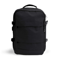 Plecak podróżny wykonany z poliestru RPET pochodzącego z recyklingu, zaprojektowany z myślą o wygodzie i funkcjonalności. Posiada wyściełane plecy i uchwyty, 2 zewnętrzne kieszenie przednie i 3 przestronne przegrody główne. Zawiera wyściełaną przegrodę na laptopa 17,3”, gniazdo USB z kablem micro USB do podłączenia Powerbanka (brak w zestawie), oddychającą przegrodę na buty oraz kieszeń antykradzieżową z tyłu i pasek do mocowania.