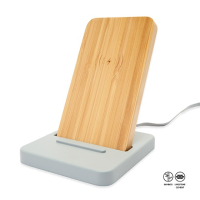 Bezprzewodowa ładowarka z podstawą z cementu wapiennego i prostokątną podstawką z naturalnego bambusa.