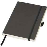 Elastyczny i miękki w dotyku notatnik (rozmiar A5) z wbudowanym elastycznym zamknięciem, wstążką, pętelką na długopis, kieszenią na dokumenty po wewnętrznej stronie okładki i 80 arkuszami (80 g) kremowego papieru w linię. Czarne opakowanie.