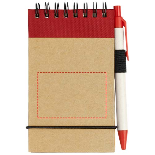 Notowanie szybkich pomysłów jest łatwe dzięki notatnikowi z recyklingu Zuse z długopisem w pasującym kolorze. Mały notatnik zawiera 40 kartek w linie z referencyjnego papieru makulaturowego A7, dzięki czemu mieści się w każdej małej lub dużej torbie, jest łatwy do trzymania, a poza tym jest to wybór zgodny z zasadami zrównoważonego rozwoju. Dostępne są różne opcje nadruku, aby umieścić dowolne logo na zewnętrznej stronie twardej okładki.