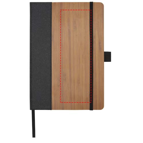 Notatnik A5 z bambusową okładką i grzbietem wykonanym ze sklejonej skóry. Zawiera 80 arkuszy, papier z recyklingu w linie o gramaturze 80 g/m2, czarną pętelkę na długopis, elastyczną taśmę i znacznik wstążkowy.
