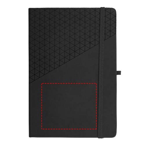 Delikatny w dotyku notes A5 z geometrycznym wzorem. Zawiera 80 kartek (80 gsm) papieru w linie, wstążkę, elastyczne zamknięcie i pętęlkę na długopis.