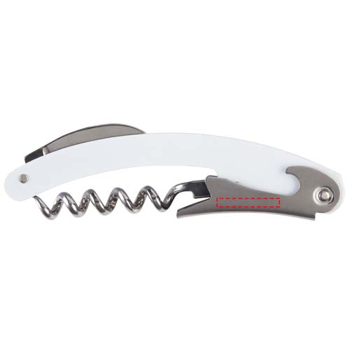 Nóż kelnerski ze stali nierdzewnej z kolorowym korpusem, wyposażony w przecinak do folii i otwieracz do butelek.