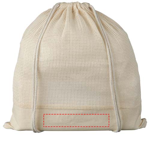 Plecak wielokrotnego użytku na owoce i warzywa wykonany z bawełnianej siatki. Posiada dużą komorę główną ze ściąganym zamknięciem. Wytrzymałość do 5 kg.