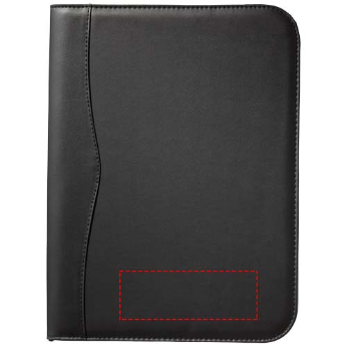 Idealny przedmiot, dzięki któremu każdy pracownik pośrednio przyczynia się do zwiększenia świadomości marki: teczka Ebony. Portfolio w formacie A4 zawiera poręczną przegródkę oraz kieszeń na zamek błyskawiczny do przechowywania dokumentów. Obok znajduje się 20-stronicowy notatnik z podszewką oraz pętelka na długopis (długopis i akcesoria nie są dołączone). Portfel zamykany jest na zamek błyskawiczny, dzięki czemu jego zawartość jest schludna i dobrze chroniona. Portfolio jest wykonane z wytrzymałej imitacji skóry i oferuje dużo miejsca na duże logo.