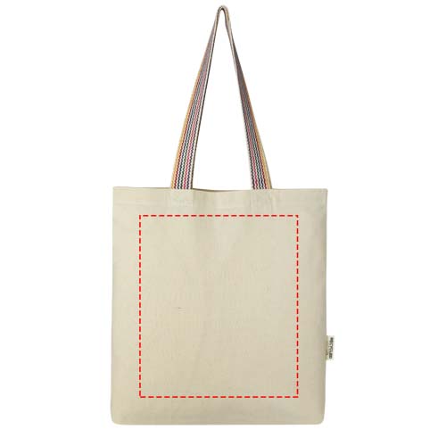 Torba na zakupy Rainbow o gramaturze 180 g/m² stanowi natychmiastowe ulepszenie zwykłej bawełnianej torby. Wykonana z przedkonsumenckiej bawełny z recyklingu, ta torba na zakupy spożywcze ma 25 cm uchwyty z tęczowej tasiemki i 3,5 cm wpust na dnie, aby zapewnić więcej miejsca do przechowywania.