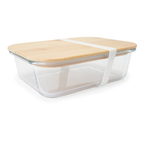 Szklane, ekologiczne pudełko na lunch z bambusowym wieczkiem i silikonowym paskiem ściągającym.