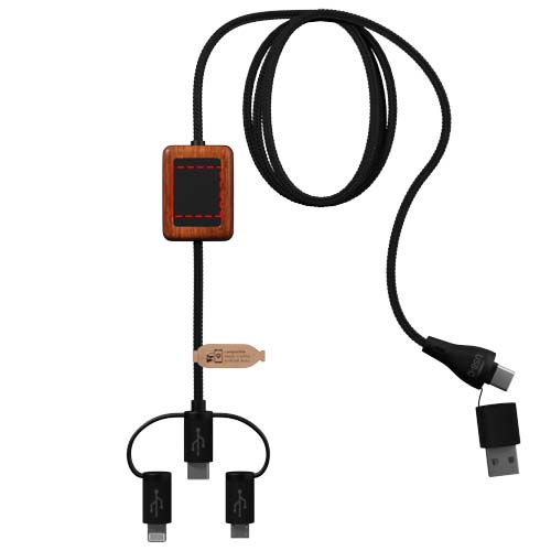 Gumowy kabel ładujący z bambusowym wykończeniem z funkcją przesyłania danych i podwójnym podświetlanym logo. Kabel jest wykonany z przyjaznych dla środowiska materiałów: plastiku ABS z recyklingu i rPET z przetworzonych butelek. Może być używany z Apple CarPlay i Android Auto do aplikacji samochodowych. Dzięki podwójnemu wyjściu USB-A i USB-C kabel jest w 100% kompatybilny z najnowszymi komputerami na rynku (USB-C). Kabel może być spersonalizowany za pomocą dwóch podświetlanych logo (po jednym z każdej strony). Długość kabla: 1 metr. Dostarczany w etui z TPU (17,5 x 5,5 cm) z papierową kartą. 3-letnia gwarancja.