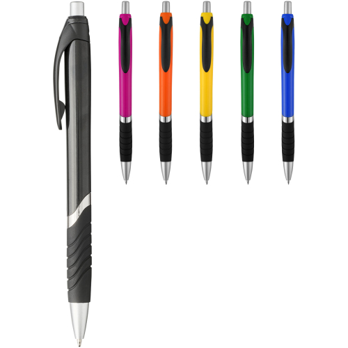 Długopis z popularnym mechanizmem wciskania, solidnym, kolorowym korpusem, czarnym gumowanym uchwytem i dodatkowymi srebrnymi akcentami wykończeniowymi. Dostępny w szerokiej gamie atrakcyjnych kolorów.