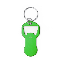 Otwieracz do butelek z brelokiem wykonanym z aluminium pochodzącego z recyklingu z monetą do wózka na zakupy. Szeroki obszar znakowania.